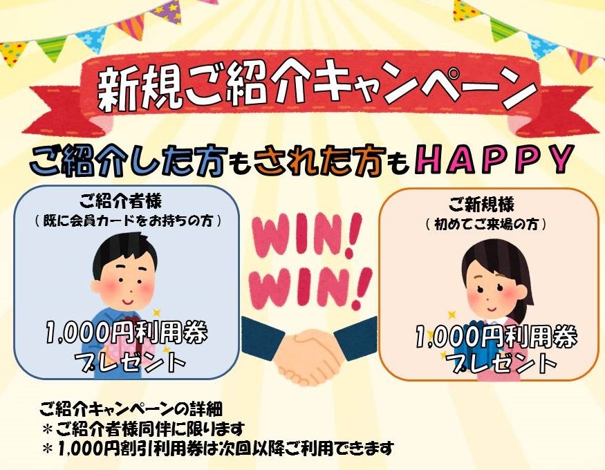 新規お客様を紹介した方、された方双方に1,000円割引利用券を進呈。 ※ご紹介者同伴に限ります。 ※...