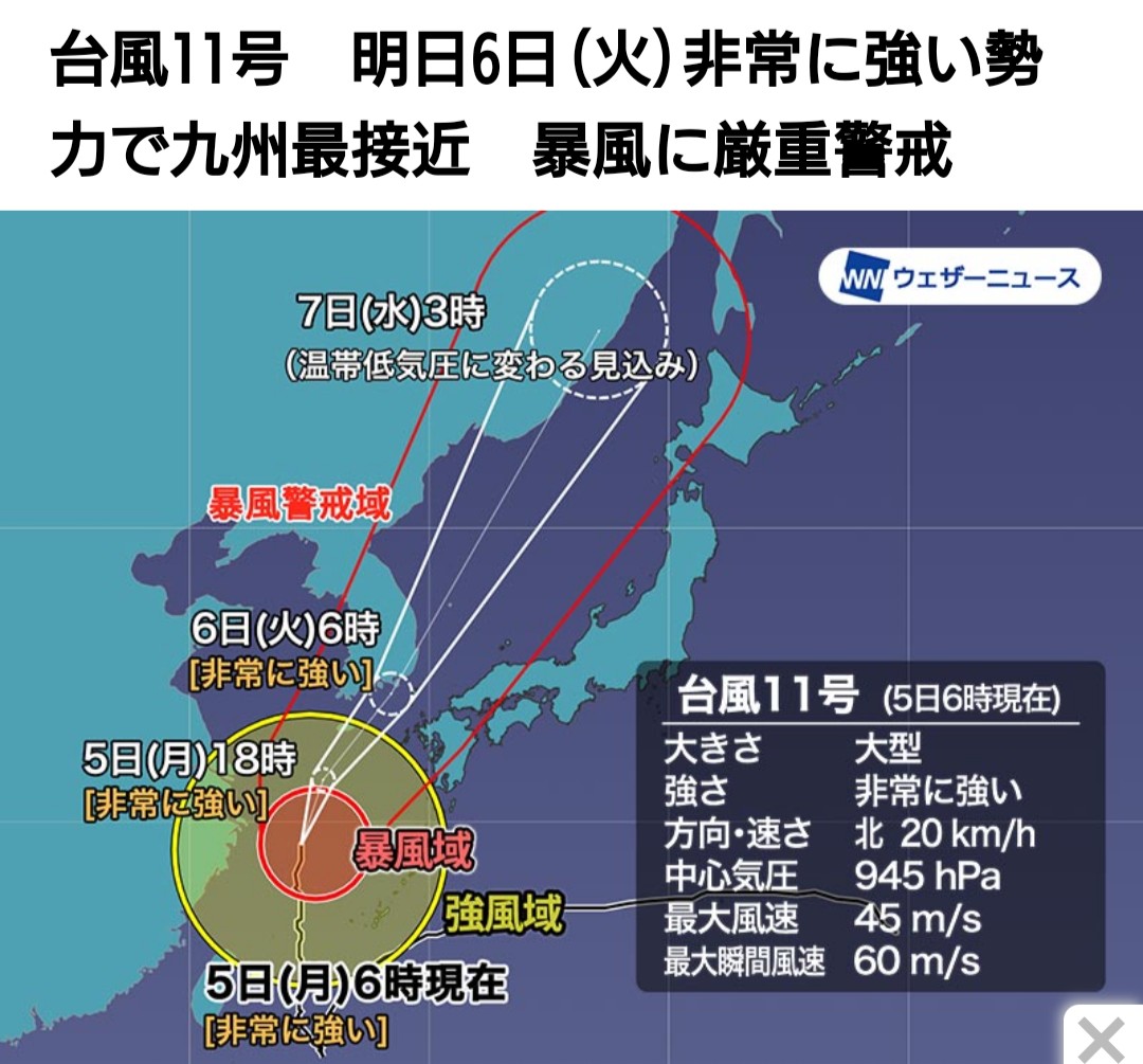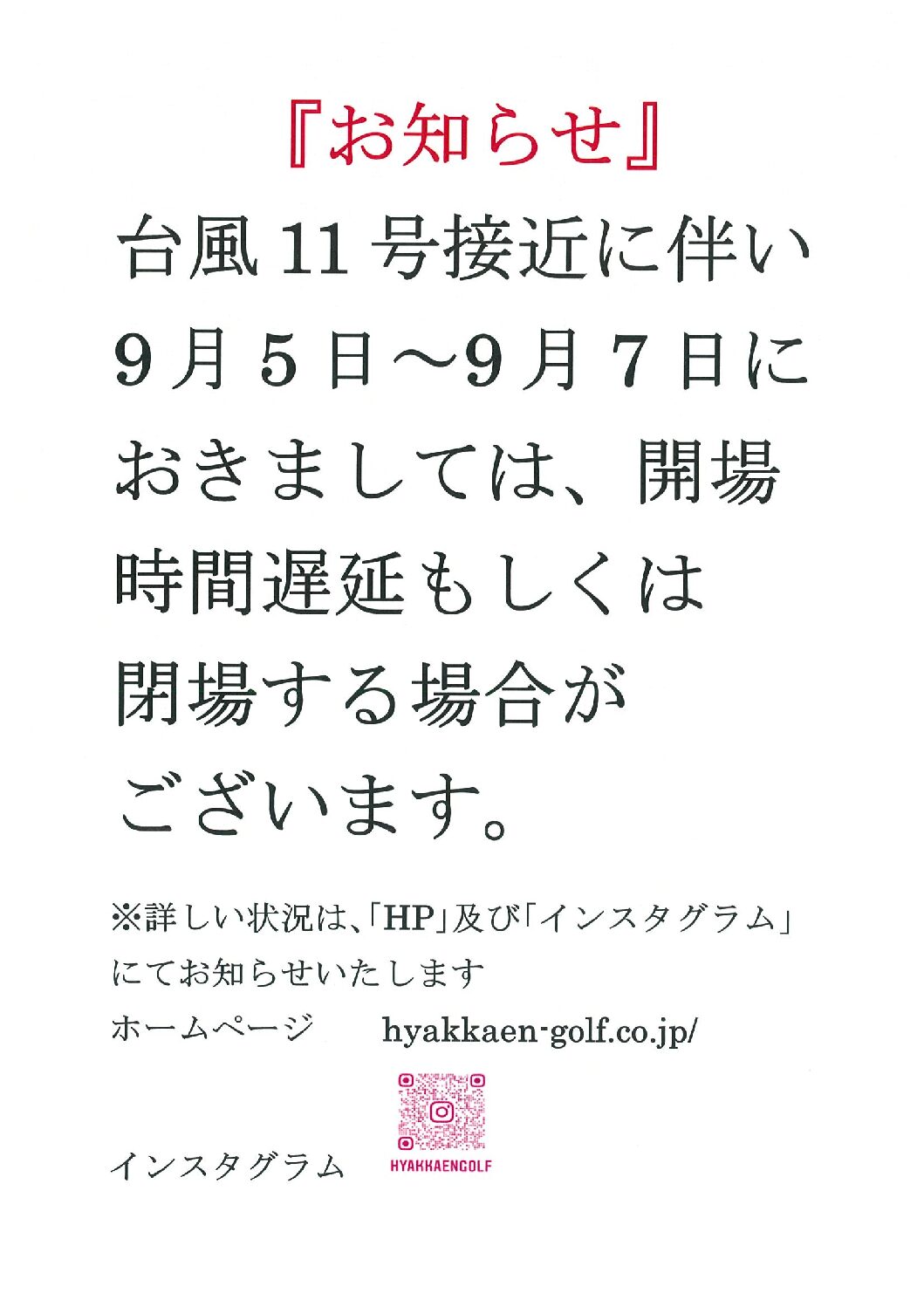 台風11号接近に伴いまして、本日9月5日は14時最終スタートと致します。 又明日9月6日につきまして...