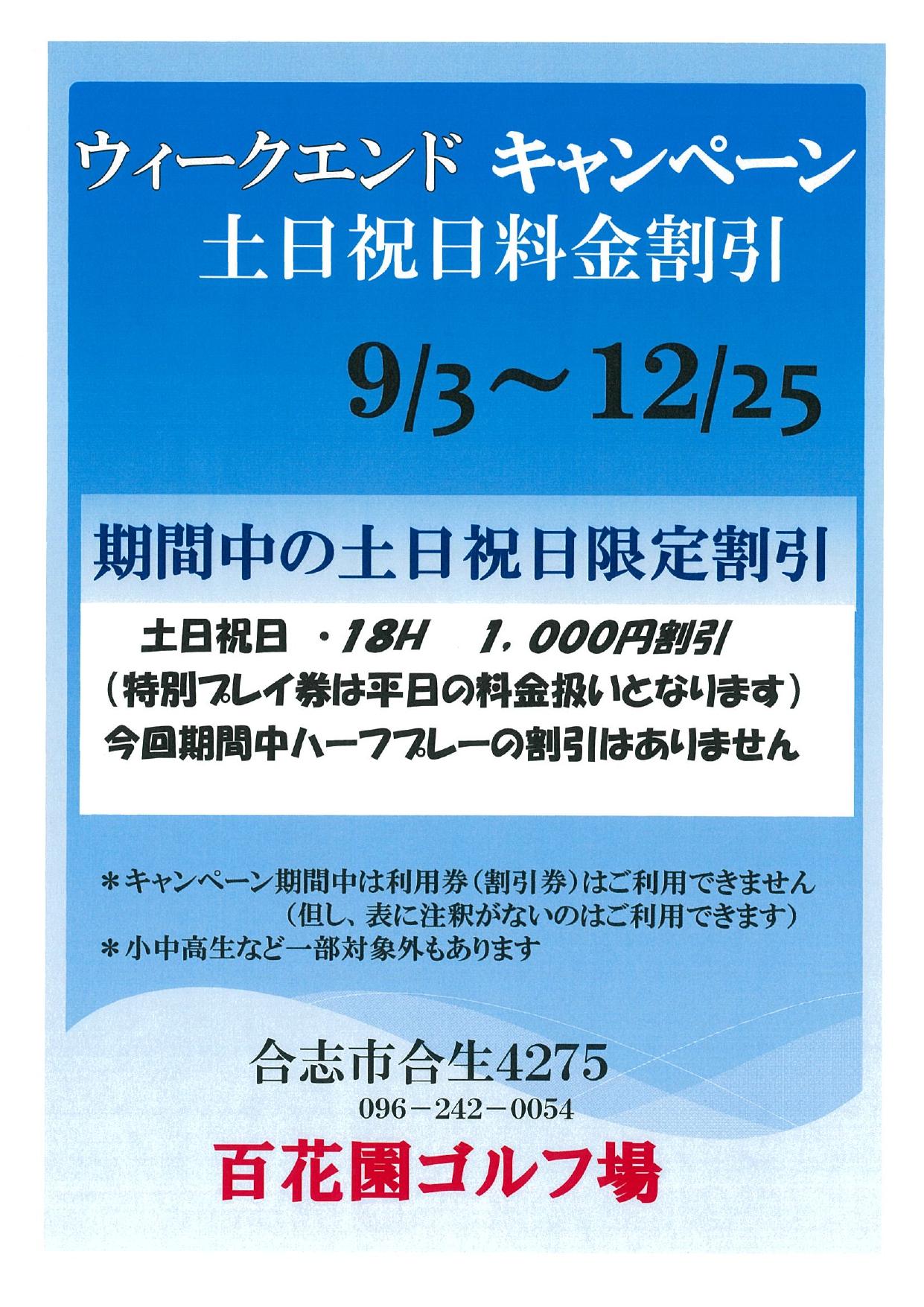 日頃の感謝を込めましてウィークエンド キャンペーン(土日祝日料金割引) を実施します 。 皆様のお越...